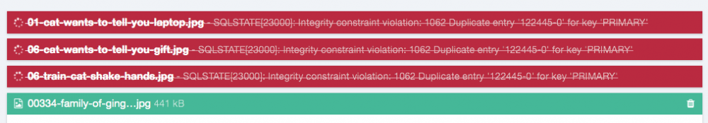 File upload error - SQLSTATE[23000]: Integrity constraint violationrenobird replied to Karl_T's topic in General Support Hi All, I've been having this issue lately and I'm not sure where to start looking. We aren't running Redis, so it's not resolved by the link @Karl_T linked above. Sometimes multiple images upload fine, sometimes i get this: Any guidance would be much appreciated. Processwire 2.8.62 PHP 5.6.25 MySQL 5.0.11