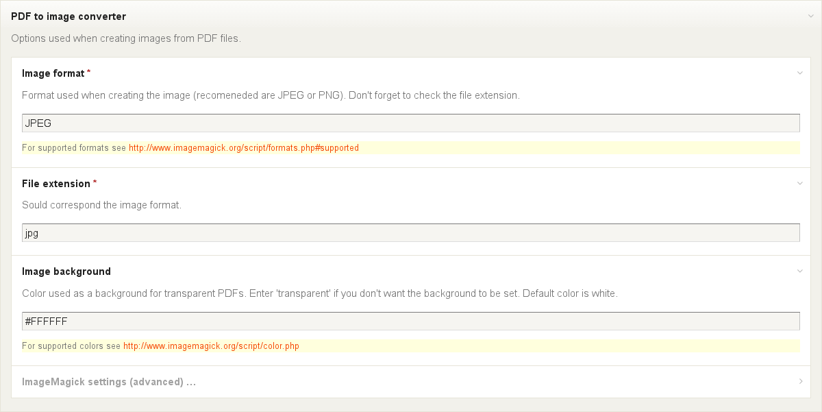'colorspace' => Imagick::COLORSPACE_RGB, // colorspace used when reading the PDF