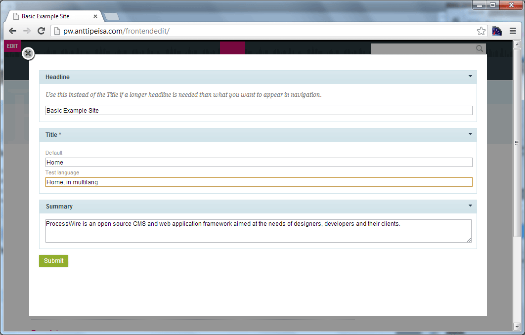 echo $fredi->render("headline|title|summary");Editing all the fields
