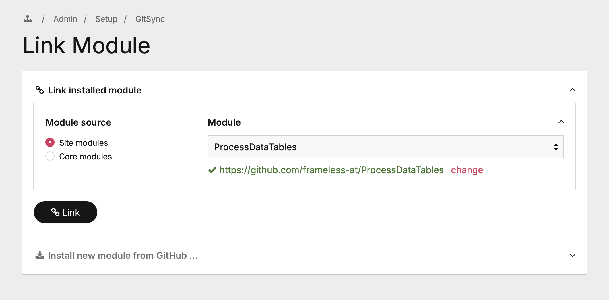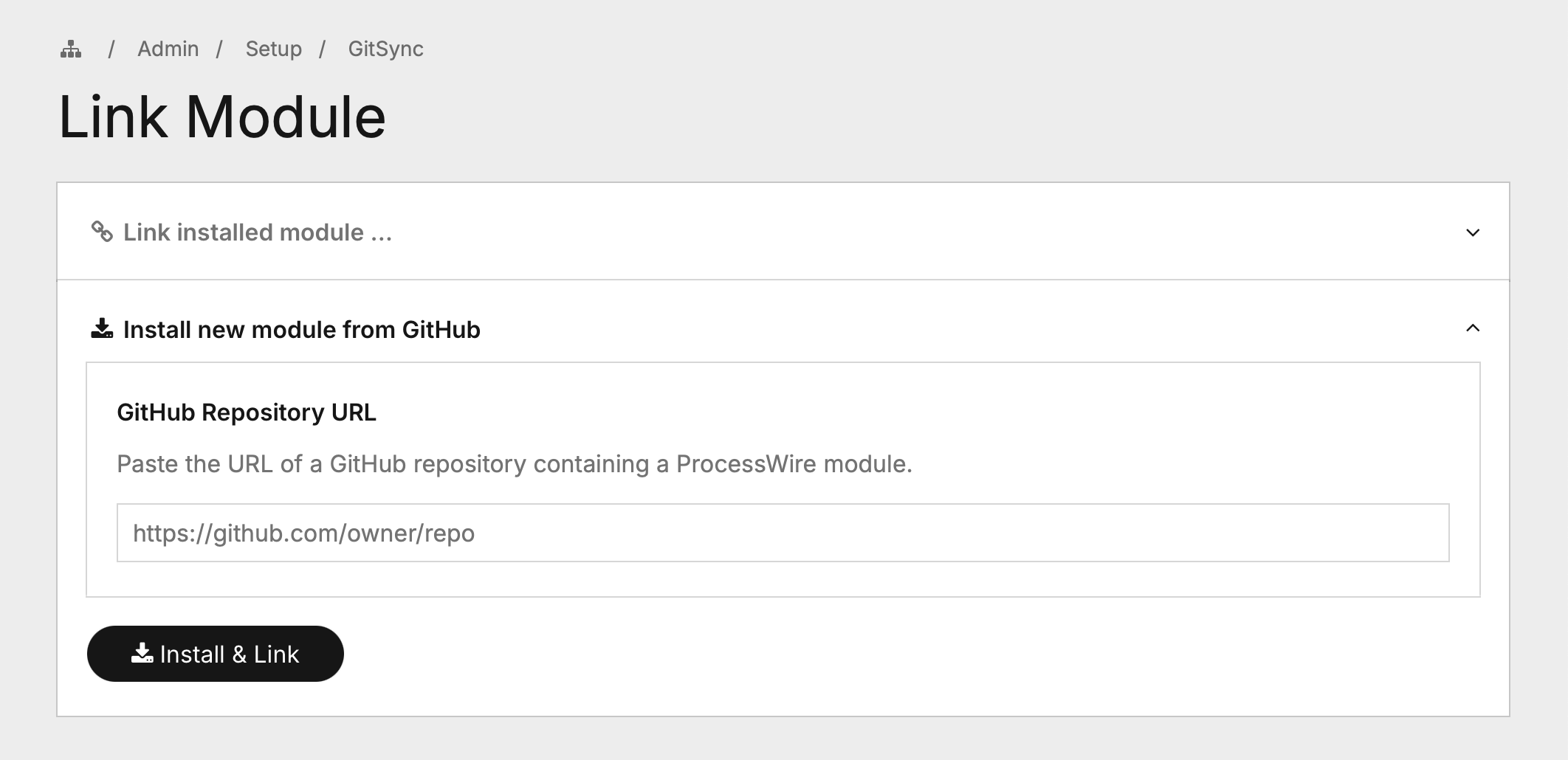 On the same page, expand Install new module from GitHub and paste the repository URL. GitSync downloads the module, installs it in ProcessWire, and links it automatically.