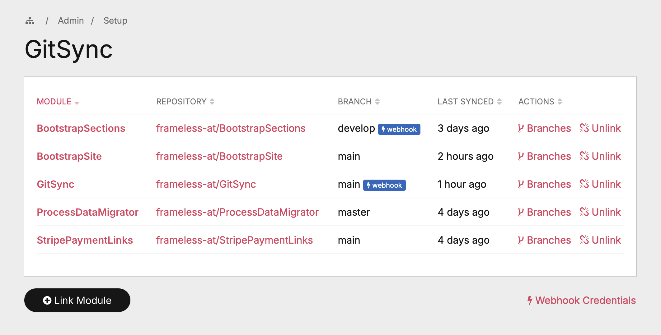 Click Link Module on the GitSync overview page. Select a module from the dropdown – GitSync automatically searches GitHub for a matching repository. You can also enter a repository URL manually.