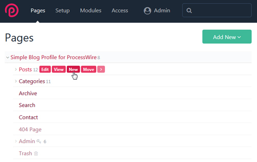 - Post page (Template: simple-blog-post) This page shows the content and a comment list with comment form provided by the FieldtypeComments which is shipped with ProcessWire.