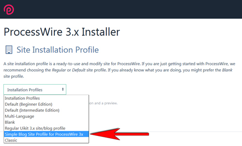 - When prompted for Site Installation Profile select Simple Blog Profile for ProcessWire 3x and continue with installation.