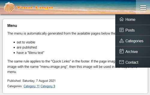 The same rule applies to the Quick Links in the footer. If the page images containing an image with the name menu-image.png, then this image will be used in the responsive menu.