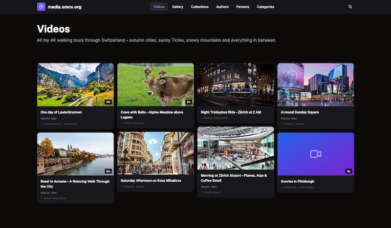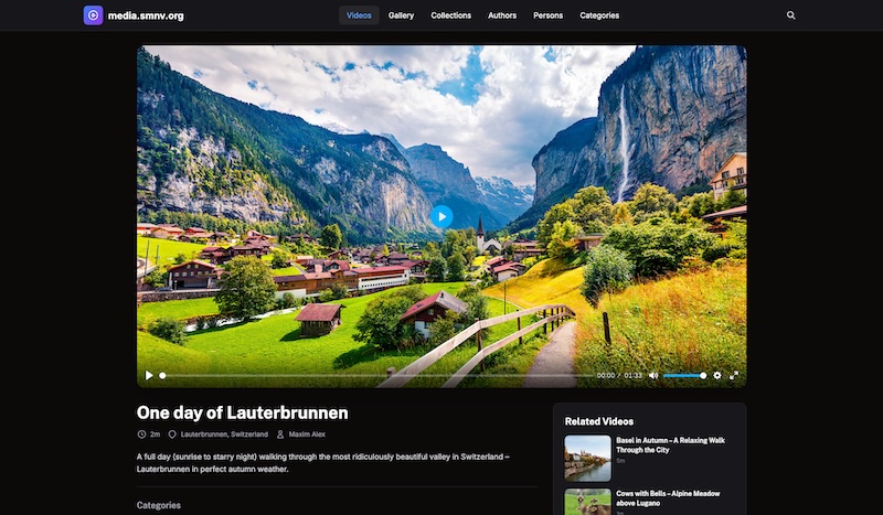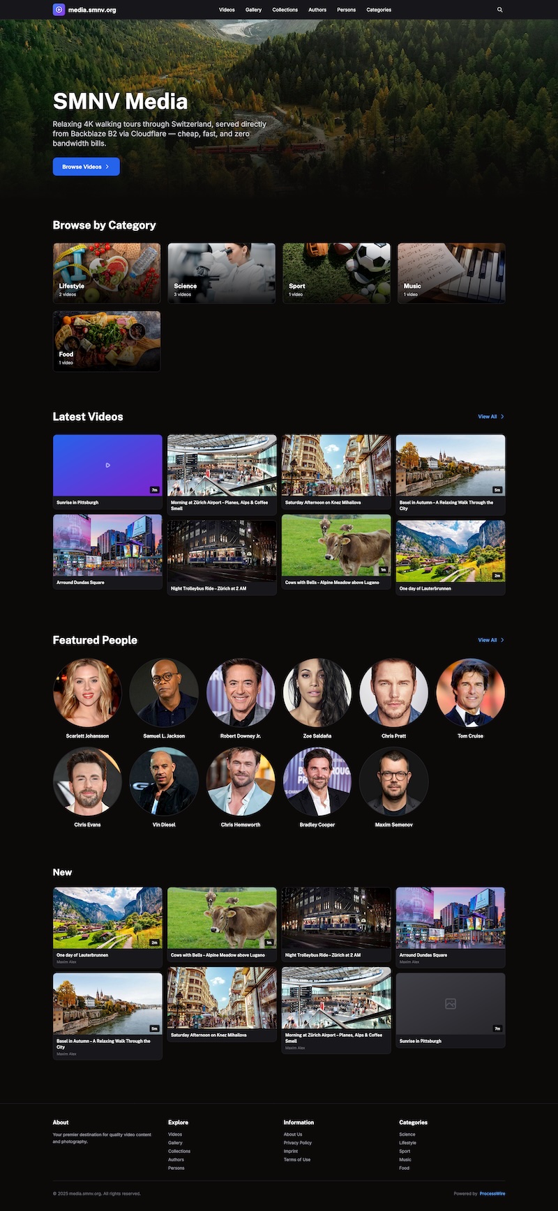 SMNV Media is a fully-featured media platform for hosting and managing video content with Backblaze B2 and Cloudflare integration. The platform showcases 4K walking tours through Switzerland, served directly from Backblaze B2 via Cloudflare with zero bandwidth costs.