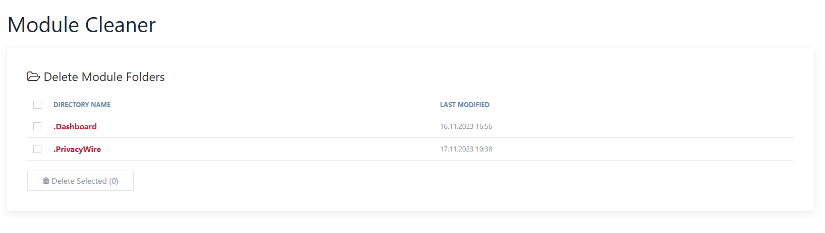 Hi everyone, I wanted to share a small utility module I’ve put together to help keep the /site/modules/ directory tidy. What it does: When updating modules ProcessWire renames old module directories by prepending a dot (e.g., .ModuleName). Over time, these "hidden" backup folders can clutter your file system. ProcessModuleCleaner identifies these orphaned directories and allows you to delete them directly from the admin interface. Key Features: Automatic Detection: Scans your site modules folder for any directory starting with a dot. Native UI: Built specifically for the ProcessWire backend using UIkit 3 classes for a seamless look. Interactive Selection: Uses AlpineJS for a fast and responsive "select all" and delete workflow. Safe Deletion: Uses ProcessWire's WireFileTools for reliable recursive directory removal. How to use: Install the module. Navigate to Setup > Module Cleaner. Review the list of found folders. Select the ones you want to remove and click "Delete". Screenshot / UI: The module displays a clean table with the folder name and the last modified date, so you know exactly how old those backups are. GitHub: https://github.com/markusthomas/ProcessModuleCleaner I hope some of you find this helpful for keeping your production or development environments clean! Feedback is always welcome. Cheers!