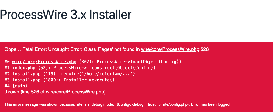 This is the error I get, just after the installation routine (DB connection, Profile import, cleanup) Fatal Error: Uncaught Error: Class 'ProcessWire\Pages' not found in /home/mysite/domains/domain.mysite.it/public_html/wire/core/ProcessWire.php:526 Stack trace: #0 /home/mysite/domains/domain.mysite.it/public_html/wire/core/ProcessWire.php(302): ProcessWire\ProcessWire->load(Object(ProcessWire\Config)) #1 /home/mysite/domains/domain.mysite.it/public_html/index.php(52): ProcessWire\ProcessWire->__construct(Object(ProcessWire\Config)) #2 /home/mysite/domains/domain.mysite.it/public_html/install.php(119): require('/home/mysite/...') #3 /home/mysite/domains/domain.mysite.it/public_html/install.php(1809): ProcessWire\Installer->execute() #4 {main} thrown (line 526 of /home/mysite/domains/domain.mysite.it/public_html/wire/core/ProcessWire.php) The only error I get from the logs. Attached is same but with colors Thank you very much -