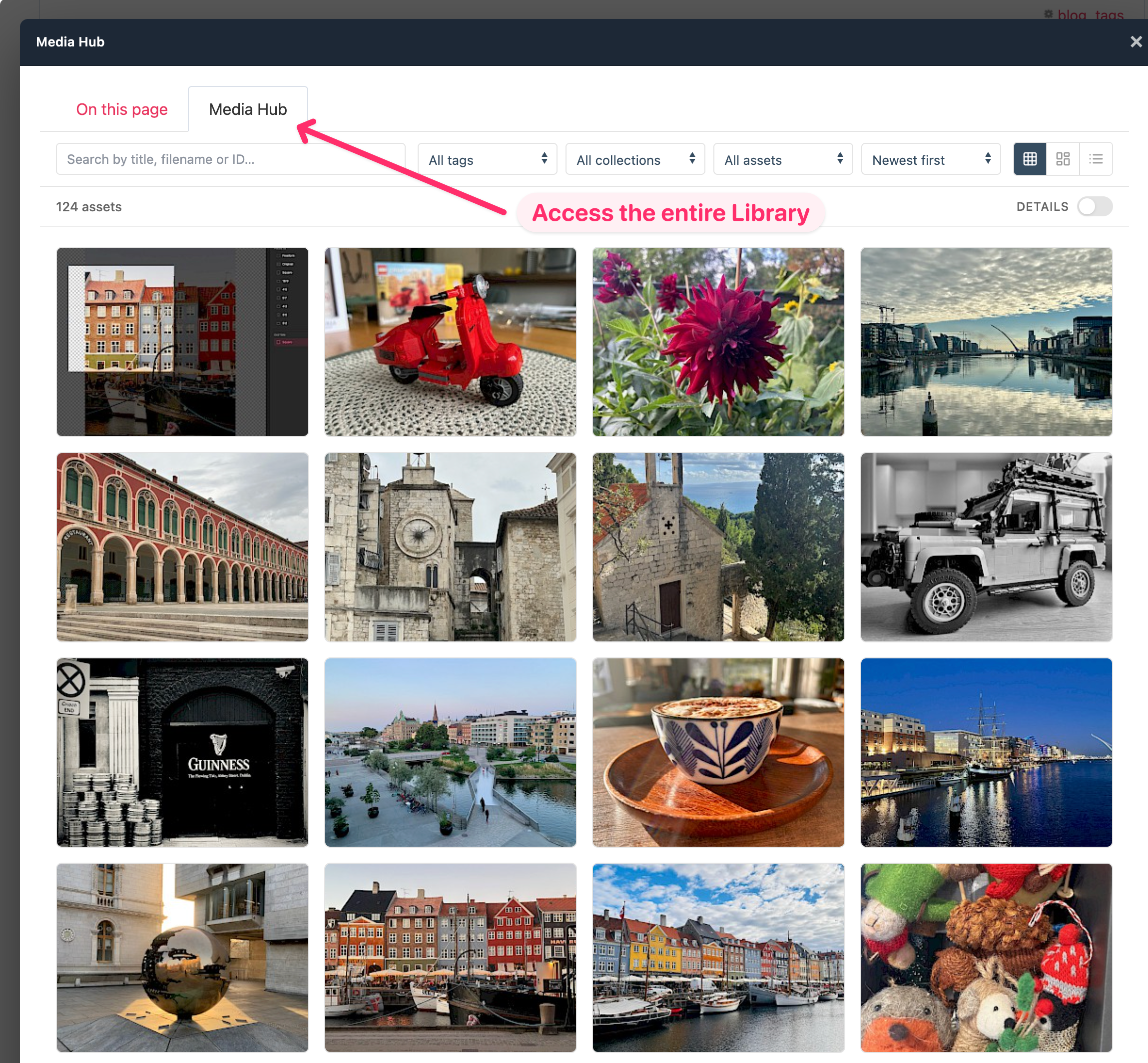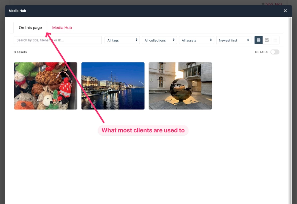 Hey a UI/UX question if anyone wants to chip in. Does this make sense? Rich Text Editors (normal flow) You click the Add Image button in TinyMCE, and the Select image window opens. You see a list of images associated with that page (only). Rich Text Editors (with MediaHub) With MediaHub, I'm no longer restricted to showing only the images attached to a page's fields. But that raises a UX question: clients are used to seeing just a handful of images tied to the page they're editing. Presenting hundreds of Library assets upfront and asking them to sort and filter isn't an improvement...if it's a sorting and filtering burden. The better approach is two tabs? On this page for the assets already attached to the current page, and MediaHub (or Library) for the full collection? Or should I only display the entire library with the users' page images positioned at the top for convenience? Cheers P