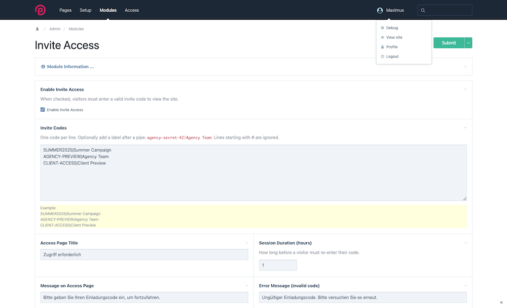 Hey everyone! I just released a new module called InviteAccess. It's something I built for my own workflow and figured it might be useful for others too. The problem: when handing off a staging site to a client or a design agency, you either open it to the world or reach for HTTP Basic Auth — which works but isn't pretty and requires server config. I wanted something in between: a proper gate page that looks like it belongs to the project, with separate codes for each team. What it does InviteAccess hooks into ProcessPageView::execute (before any template rendering) and blocks all frontend requests until a valid invite code is entered. Logged-in ProcessWire users always pass through automatically. You define codes in the module config, one per line: SUMMER2025|Summer Campaign AGENCY-PREVIEW|Agency Team CLIENT-ACCESS|Client Preview The label after the pipe shows up in the access log, so you can see exactly which team accessed the site and when. Features Multiple invite codes with optional labels Session-based auth — enter once, stays valid for a configurable number of hours JSON access log with timestamp, IP, user agent, URL — last 50 entries shown right in the admin config panel Light / Dark / Auto theme switcher on the gate page (saved in localStorage, reacts to OS preference) Accent color setting — red, blue, green or black Configurable allowed pages that bypass the gate entirely CSRF protection, hash_equals() for timing-safe comparison, Cloudflare-aware IP detection The gate page uses ApfelGrotezk font and a design inspired by processwire main page itself — warm gray background, white card, mobile-first. Screenshots Installation cd site/modules git clone https://github.com/mxmsmnv/InviteAccess.git Then Modules → Refresh → Install → Configure. GitHub: https://github.com/mxmsmnv/InviteAccess Happy to hear any feedback or suggestions!