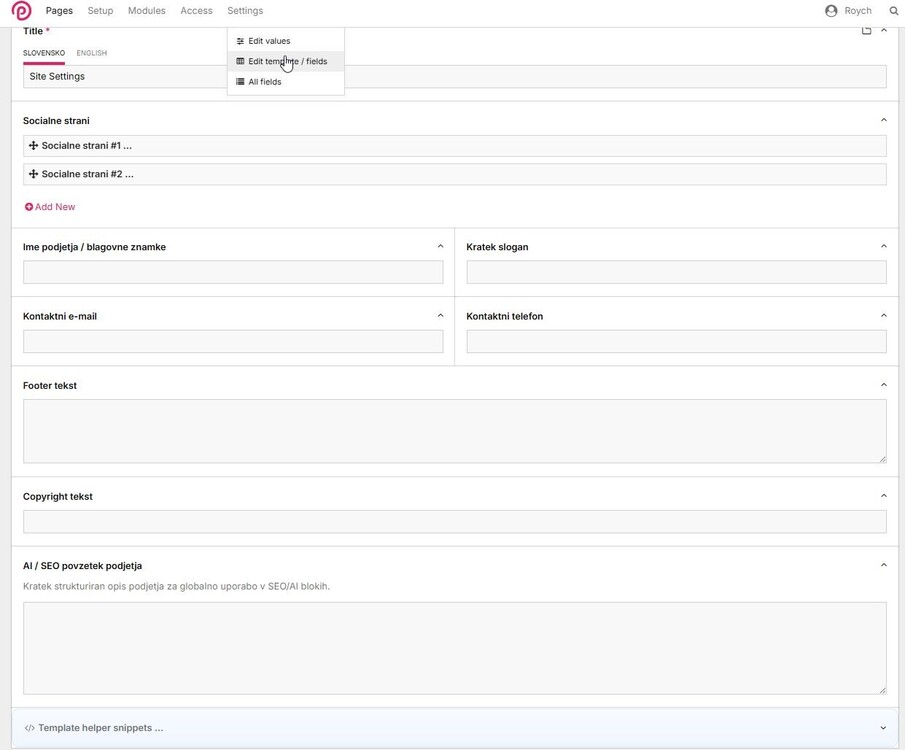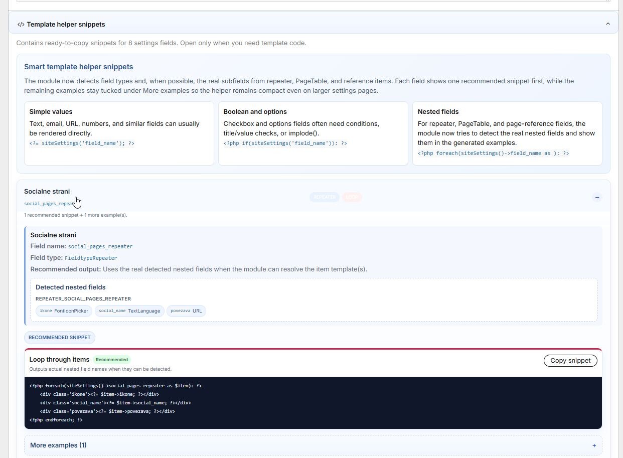 I made a small module called ProcessSiteSettings and thought I’d share it here in case it’s useful to someone. ProcessSiteSettings is a lightweight ProcessWire module for storing and editing global site values in one place. There are already similar modules available, so this is simply another free option with a focus on quick setup, usability, and helpful template snippets. It adds a Settings item to the ProcessWire admin menu and creates one central page for global site values like: copyright text footer content contact info social links SEO / AI summary text images repeaters Repeater Matrix page references other regular PW fields Ofc. add your own fields of choice to it, or delete the ones you don't need! It uses a normal template + page approach instead of a fake config form, so it works much more naturally with ProcessWire fields. It also includes a small helper box on the settings edit screen that shows ready-to-use template snippets for each field. It tries to generate smarter examples depending on the field type, including more complex fields like images, repeaters, matrix items, multi-value fields, etc. Settings Menu: Editing Values, adding/deleting custom fields and shortcut to Fields for quick creation of new ones. Quick helper for showing everything on frontend! Example usage on templates: <?= siteSettings('ss_copyright_text'); ?> <?= siteSettings()->ss_footer_text; ?> <?= $siteSettings->ss_contact_email; ?> The admin is in English and the module is translation-ready. Just install the module, and that's it! Just sharing it here in case someone finds it useful. Download Here: ProcessSiteSettings.zip