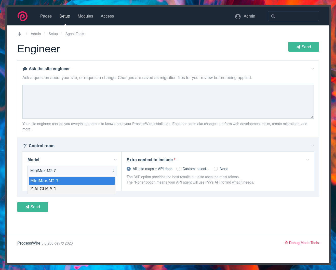 Okay multi-model support is now ready and in the current posted version (v5) of AgentTools: Multi-model support — configure additional AI providers/models beyond the primary; each uses its own API key and endpoint Additional models textarea in module config accepts one model per line in pipe-separated format: model | api-key, model | api-key | endpoint, or model | api-key | endpoint | label; provider is auto-detected from the key prefix (sk-ant-* = Anthropic, all others = OpenAI-compatible); whitespace around pipes is optional; lines beginning with # are ignored Control room collapsible fieldset in the Engineer form with model selector and context options; auto-expands when non-default settings are saved Context selector radio in Control room: All (site maps + API docs), Custom (choose individual items), or None (no extra context, useful for general questions or token-limited providers) There's still about 2-3 hours left on the memory feature, which I don't have today, so that'll be in a day or two. If anyone wants a free AI tool (api key) to use with AgentTools, Groq ("groq" not "grok") seems to do fairly well with ProcessWire: https://console.groq.com/home -- note however that on the "Engineer" screen in AgentTools, you'll want to select "Extra content to include: None" because the free Groq doesn't not accept a lot of data in the submitted prompts. But it can still query your ProcessWire installation for all of that info, so it works just fine.