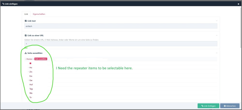 Dear community, I am searching for a solution to show the items of a repeater field in the link dialog window. More in detail: the items of repeater_1 (Repeater field) should be selectable in the link dialog window of text_1 (TextareaLanguage/CKEditor field). The two fields are located in the same template. The repeater items should be selectable just as you normally can select pages. Any suggestions? I would really appreciate your help! Best Nomak