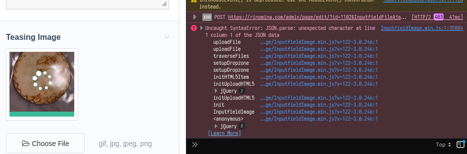 2. Hello, I am facing an upload issue. I get this JS error when I drop images in image fields: XHR POSThttps://foo.com/admin/page/edit/?id=1102&InputfieldFileAjax=1[HTTP/2 403 41ms] Uncaught SyntaxError: JSON.parse: unexpected character at line 1 column 1 of the JSON data uploadFile https://foo.com/wire/modules/Inputfield/InputfieldImage/InputfieldImage.min.js?v=122-3.0.246:1 uploadFile https://foo.com/wire/modules/Inputfield/InputfieldImage/InputfieldImage.min.js?v=122-3.0.246:1 traverseFiles https://foo.com/wire/modules/Inputfield/InputfieldImage/InputfieldImage.min.js?v=122-3.0.246:1 setupDropzone https://foo.com/wire/modules/Inputfield/InputfieldImage/InputfieldImage.min.js?v=122-3.0.246:1 setupDropzone https://foo.com/wire/modules/Inputfield/InputfieldImage/InputfieldImage.min.js?v=122-3.0.246:1 initHTML5Item https://foo.com/wire/modules/Inputfield/InputfieldImage/InputfieldImage.min.js?v=122-3.0.246:1 initUploadHTML5 https://foo.com/wire/modules/Inputfield/InputfieldImage/InputfieldImage.min.js?v=122-3.0.246:1 jQuery 2 initUploadHTML5 https://foo.com/wire/modules/Inputfield/InputfieldImage/InputfieldImage.min.js?v=122-3.0.246:1 init https://foo.com/wire/modules/Inputfield/InputfieldImage/InputfieldImage.min.js?v=122-3.0.246:1 InputfieldImage https://foo.com/wire/modules/Inputfield/InputfieldImage/InputfieldImage.min.js?v=122-3.0.246:1 <anonymous> https://foo.com/wire/modules/Inputfield/InputfieldImage/InputfieldImage.min.js?v=122-3.0.246:1 jQuery 8 InputfieldImage.min.js:1:35804 I updated PW recently and also upgraded the PHP version. Maybe that can be related!