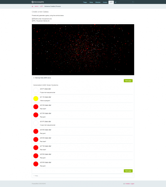 I did a develop and made dis, a procedural galaxy that, well... gets procedurally generated. You can use your mouse to zoom in/out and look around. You can click on stars to get their specific information. It's inspired by the galaxy maps found in games like Elite Dangerous and Eve Online. http://fransvanberendonk.com/procedural-galaxy/ Basicly I've made Templates and Fields for Spectral Classes and Subclasses, and looked up online what a realistic distribution scheme would be for these. This data is grouped under a page that renders then as JSON for the Javascript application to work with. I wrote that app in AngularJS, so I could add more controllers to it later. It also uses BabylonJS to calculate the number and position of stars and display them on screen, and assigns each a Spectral Class and Subclass after some shuffling of the dataset. Using a secondary controller only used in a ProcessModule for the CMS, I can broadcast events that redo the procedure using different variables (see screenshot below). No particular purpose, just thought I'd share a cool side project that rolled out of my exploration of these JS frameworks in conjunction with PW.7 points