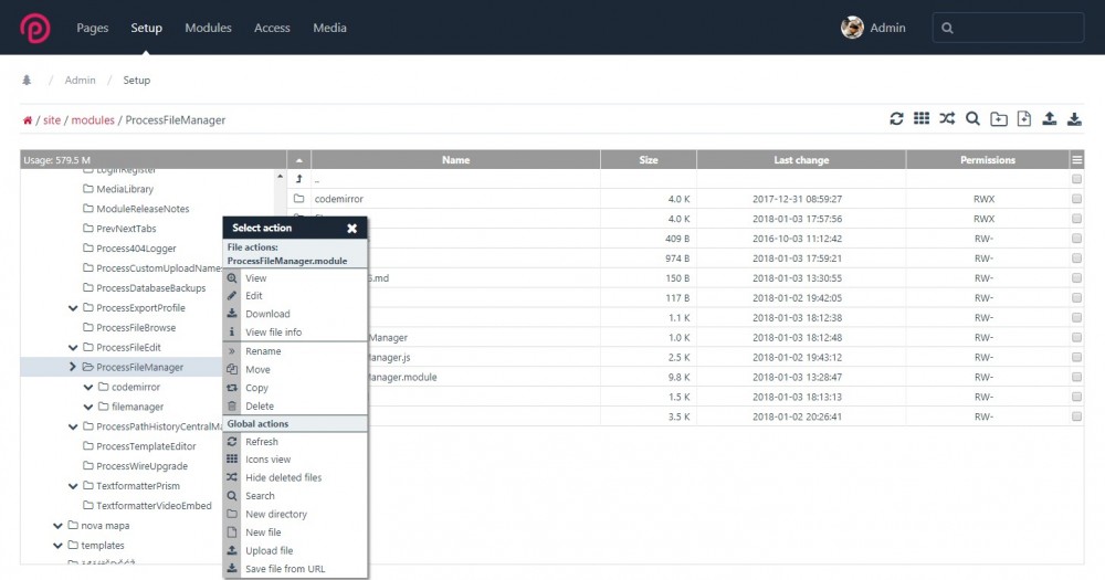 A module for managing files and folders. Supports creating, opening (e.g. viewing, playing, editing), renaming, moving, copying, deleting and searching for files. You can also view and change (not supported on Windows) file and directory permissions. https://github.com/matjazpotocnik/ProcessFileManager The author of FileManager component is (c) 2006 - 2018 Gerd Tentler, http://www.gerd-tentler.de/tools/filemanager/. I modified it to work with ProcessWire as a module. Please see license files on usage in commercial projects!1 point