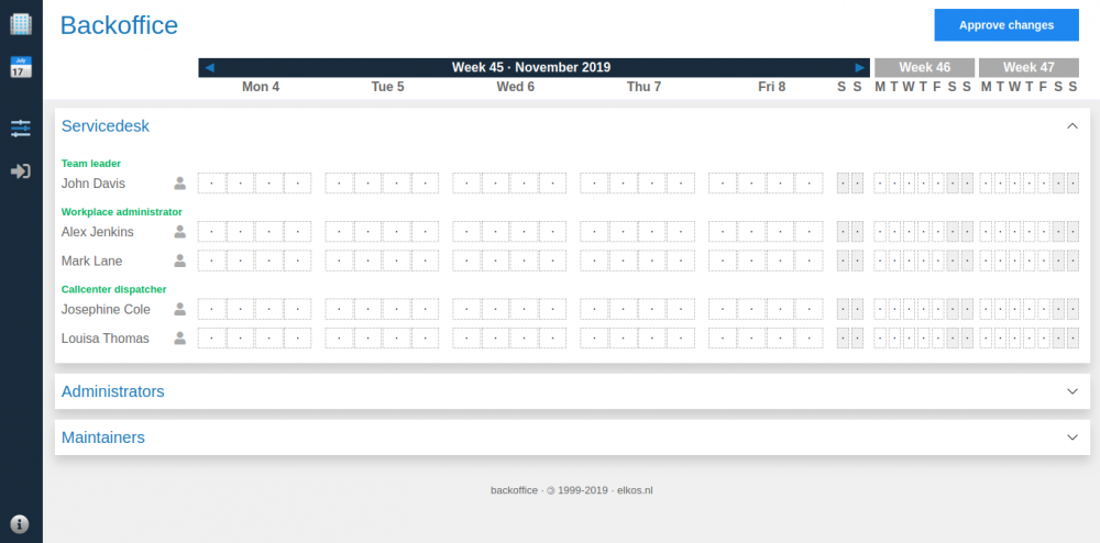 Hello group, I would like some input on how to store the data for a project I'm currently working on. It is a Backoffice application for teams, where each day is divided into 4 sections, representing the eight working hours in a day as two-hour time slots. The time slots will be filled with a letter and a color, indicating the task that the team member is appointed to at that time. I have attached some screenshots so you can get a general idea of what it looks like (tried to make a GIF screencast with 'peek' but the file turns out too big every time to post here). The attached files show the Backoffice application itself and how I organized it in the back end of Processwire. Teams are pages, containing functions in the team. The members of a team are implemented as an ASM select field on the functions pages, that point to the Admin->Access->Users pages. Every user has access to their own profile page in the back end, but no other pages are allowed for them. As for storing the time slot data. I could create a separate database, or use Processwire to create trees of pages --under the Users pages-- with the date timestamp and task ID for that day, but I don't know yet how that would scale in Processwire when there is more-and-more page data in the Backoffice over time. With many team members, that tree could grow quite large, because it has to also be kept there as an archive for making reports about the working time the teams and members spent on what tasks in the past. So, I would appreciate some input from you on how you would store the time slot data in a case like this. Kind regards, Elko PS: I've been using Processwire since March this year and really like it so far, so thank you for making a great product like this.1 point