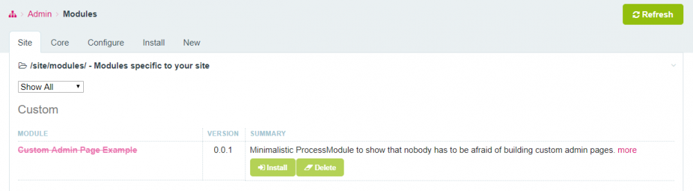 Edit: Because of the great response to this topic I wrote a guest blogpost: https://processwire.com/blog/posts/building-custom-admin-pages-with-process-modules/ One of the hidden treasures of processwire seems to be the creation of custom admin pages. Technically speaking those pages are ProcessModules - but i guess that's the reason why so many people out there seem to be afraid of building them... it sounds so hard! You've never created a module for ProcessWire? You have never created a plugin for any other CMS? You have no clue about OOP with all its classes, methods and properties? No problem! I'll show you how simple you can start: <?php class CustomAdminPage extends Process { public static function getModuleinfo() { return [ 'title' => 'Custom Admin Page Example', 'summary' => 'Minimalistic ProcessModule to show that nobody has to be afraid of building custom admin pages.', 'href' => 'https://processwire.com/talk/topic/17709-how-to-create-custom-admin-pages-aka-processmodules-yes-its-that-simple/', 'author' => 'Bernhard Baumrock, baumrock.com', 'version' => 1, // page that you want created to execute this module 'page' => [ 'name' => 'customadmin', // your page will be online at /youradmin/setup/customadmin/ 'parent' => 'setup', 'title' => 'Custom Admin Page Example' ], ]; } public function ___execute() { return 'This is the most simple Admin-Page you have ever seen :)'; } } Now save this file as CustomAdminPage.module and place it in your /site/modules folder. After a refresh it will show your module in the modules manager of your site where you can install it: After installation you already have your first very own admin page! Congratulations! Was not too hard, was it? It's as simple as that! Now lets add some more custom HTML. And to show you another nice feature we will add this code to a separate method called executeDemo(). And because everything is so simple we will also add some javascript to this page public function ___executeDemo() { $out = ''; $out .= '<h1>H1 has some special css styling in the admin, thats why it seems to have no effect</h1>'; $out .= '<h2>H2 looks different ;)</h2>'; $out .= '<h3>...and so does H3</h3>'; $out .= '<button onclick="myFunction()">Click me</button>'; $out .= '<script>function myFunction() { alert("this is a demo javascript"); }</script>'; return $out; return ''; } Now thanks to ProcessWire-magic your page will already have its own URL: Just append /demo to your url and see what you get: And of course don't forget to click the button Ok, now that code looks a bit hacky, right? Inputfields and especially InputfieldMarkup for the win! We add another method with some advanced code. To use inputfields we need a form that holds all those inputfields and that makes it possible to handle user input lateron. See somas great tutorial about forms here for a quickstart and more details: public function ___executeAdvanced() { $out = '<h2>A more complex Example</h2>'; $form = wire()->modules->get('InputfieldForm'); $field = wire()->modules->get('InputfieldMarkup'); $field->label = 'Markup Test 1'; $field->value = '<h1>h1</h1><h2>h2</h2><h3>h3</h3><h4>h4</h4>'; $form->add($field); $out .= $form->render(); return $out; } Ok, it get's boring Let's do something more fun and add a chart in a second field and change the fields to 50% screen width (I'm sure you know that already from the GUI template editor)! public function ___executeAdvanced() { $out = '<h2>A more complex Example</h2>'; $form = wire()->modules->get('InputfieldForm'); $field = wire()->modules->get('InputfieldMarkup'); $field->label = 'Markup Test 1'; $field->value = '<h1>h1</h1><h2>h2</h2><h3>h3</h3><h4>h4</h4>'; $field->columnWidth = 50; $form->add($field); $field = wire()->modules->get('InputfieldMarkup'); $field->label = 'Chart Sample'; $field->value = '$chart'; //$field->notes = 'Example code taken from here: http://www.chartjs.org/docs/latest/getting-started/usage.html'; $field->columnWidth = 50; $form->add($field); $out .= $form->render(); return $out; } OK, we are almost there... we only need to add the chart library! To keep everything clean we will put the code for the chart in another method. We will make that method PRIVATE to add some security. Our new Method: private function renderChart() { // prepare chart code wire()->config->scripts->add('https://cdnjs.cloudflare.com/ajax/libs/Chart.js/2.1.3/Chart.min.js'); ob_start(); ?> <canvas id="myChart"></canvas> <script> var ctx = document.getElementById("myChart"); var myChart = new Chart(ctx, { type: 'bar', data: { labels: ["Red", "Blue", "Yellow", "Green", "Purple", "Orange"], datasets: [{ label: '# of Votes', data: [12, 19, 3, 5, 2, 3], backgroundColor: [ 'rgba(255, 99, 132, 0.2)', 'rgba(54, 162, 235, 0.2)', 'rgba(255, 206, 86, 0.2)', 'rgba(75, 192, 192, 0.2)', 'rgba(153, 102, 255, 0.2)', 'rgba(255, 159, 64, 0.2)' ], borderColor: [ 'rgba(255,99,132,1)', 'rgba(54, 162, 235, 1)', 'rgba(255, 206, 86, 1)', 'rgba(75, 192, 192, 1)', 'rgba(153, 102, 255, 1)', 'rgba(255, 159, 64, 1)' ], borderWidth: 1 }] }, options: { scales: { yAxes: [{ ticks: { beginAtZero:true } }] } } }); </script> <?php return ob_get_clean(); } Now we just need to call $this->renderChart() in the right place! Here is the complete Module: <?php class CustomAdminPage extends Process { public static function getModuleinfo() { return [ 'title' => 'Custom Admin Page Example', 'summary' => 'Minimalistic ProcessModule to show that nobody has to be afraid of building custom admin pages.', 'href' => 'https://processwire.com/talk/topic/17709-how-to-create-custom-admin-pages-aka-processmodules-yes-its-that-simple/', 'author' => 'Bernhard Baumrock, baumrock.com', 'version' => 1, // page that you want created to execute this module 'page' => [ 'name' => 'customadmin', // your page will be online at /youradmin/setup/customadmin/ 'parent' => 'setup', 'title' => 'Custom Admin Page Example' ], ]; } public function ___execute() { return 'This is the most simple Admin-Page you have eve