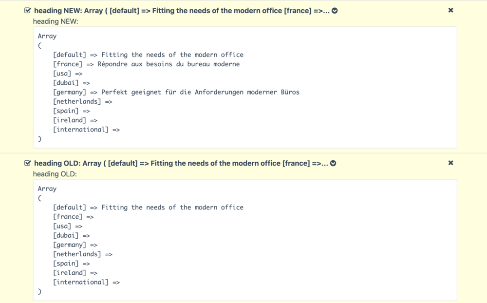 Hi all, I'm having trouble with an import. Some translated text imports correctly, some doesn't. There are no errors or warnings displayed. Background We're running a big import on a file which was originally exported using the built in Export/Import module. Trying this both in the Admin, and by using $importer = new PagesExportImport(); $importer->importJSON($json); Seems like some text imports correctly, some doesn't. Some fields which work are inside MatrixRepeaters, some are just fields on the page. The same field types even work some places but not others. The import runs without error, and the message shown suggests all the fields imported correctly. Debugging I have been trying to identify if anything is failing silently. I've been reading PagesExportImport.php and I think line #978 is the function call where the imported field content is saved: $page->set($field->name, $pageValue) The thing is, when I print the values either side of this function, the field values are correct. I'm not familiar enough with the inner workings of PW to really understand what might be going on. Next steps Where else should I check? Are there any other functions used to save imported field content? Or are there any better ways to go about debugging this? Thanks! Edit - I've attached 2 screenshots. the Messages are with const debug = true; set in ProcessPagesExportImport.module. I believe they show that the import should have worked. The heading screenshot field shows that the translations didn't import correctly. I'm not sure if this is a bug or something I'm missing.1 point
