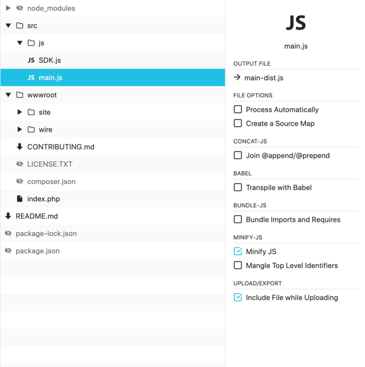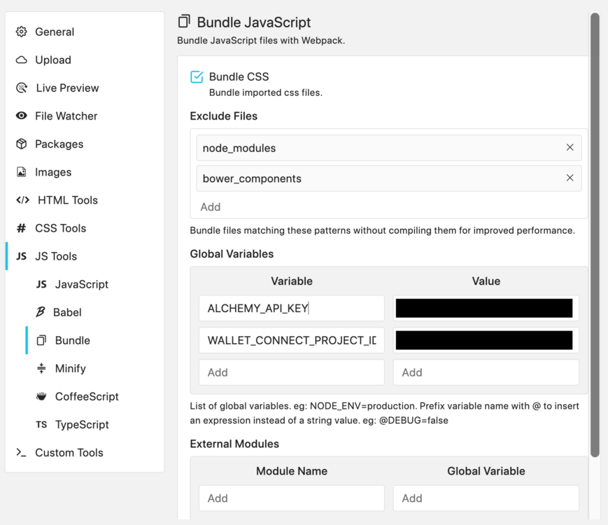 Hello PW forums, I started using Prepros after coming across it on various discussions here. I've got a local dev environment going using Prepros + MAMP server as proxy. I was curious to try this specifically for the bundling js feature. I am trying a new folder structure and wanted to experiment with some Node.js package (via npm). My project is structured: . ├── node_modules ├── src/ │ └── js/ │ └── main.js ├── wwwroot/ │ ├── site/ │ │ └── templates/ │ │ └── scripts/ │ │ └── main-dist.js │ ├── wire/ │ └── index.php ├── .env ├── package.json └── prepros.config ProcessWire core lives in the wwwroot and is served via MAMP configured as a virtual host to that specific path and served at https://localhost:8848 via. Prepros. Because I am not spinning up npm run dev or node locally, I bundle the main.js via Prepros JS Bundle features to get a main-dist.js file that I move into the PW site/templates/scripts/ directory and which I then call in the _main.php <head> section in /site/templates/ I also specify the Global Variables in Prepros (.env variables that I want to access in main.js) const chains = [mainnet, polygon] const projectId = process.env.WALLET_CONNECT_PROJECT_ID; const alchemyKey = process.env.ALCHEMY_API_KEY; Now interestingly when Bundling JS with Prepros, it creates several named files in addition to the main-dist.js file, which I need to also include into the site/templates/scripts/ dir otherwise it I receive errors in console. I don't understand what exactly all those files are really doing other than … dependencies being bundled ? 1..prepros_main-dist.js 2..prepros_main-dist.js 3..prepros_main-dist.js 4..prepros_main-dist.js 5..prepros_main-dist.js 6..prepros_main-dist.js 7..prepros_main-dist.js Finally, the Global variables I set in Prepros do not seem to be defined when reloading the local dev/server (console errors). Is there something I am missing? This .env variable business has really taken me for a spin … especially seeing as how in production the parameters change quite substantially. I am not sure what the best practice is for production, but I seem to be trying to adhere to standard practice for local dev ? Any pointers from Prepros users much appreciated! Thanks,