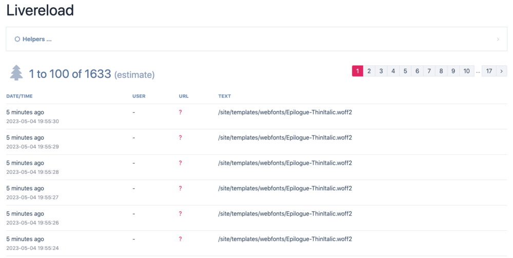 I seem to be running into an issue where woff2 fonts that I have manually added to site/templates/webfonts directory are triggering livereload in an endless loop every second. I tried setting the livereload config to have a longer interval, e.g. '2', but this seemed to stop livereload from registering changes entirely. $config->livereload = ['interval' => 2]; The Livereload logs shows (at random) one of several woff2 files repeatedly. Is there something I am missing with regard to adding fonts? Should I exclude the webfonts directory from livereload, and if so, what is the proper syntax for doing so using the 'exclude' parameter ? Thanks @bernhard -