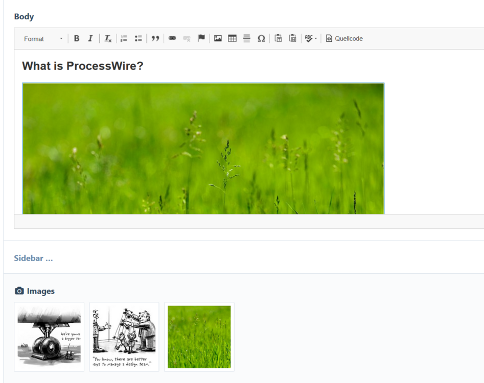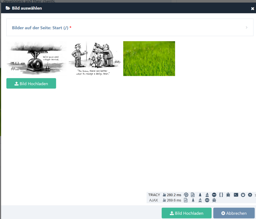 Hello everyone, I have the following fields: a TinyMCE and an image field. But when I select an image, I can't insert it into TinyMCE. What do I have to do to make this work? and (additional question): Tiny loads very slowly, it feels like 5 seconds after the rest of the editing mask is already displayed. public function migrate() { $rm = $this->rockmigrations(); $rm->migrate([ 'fields' => [ self::field_text => [ 'type' => 'textarea', 'inputfieldClass' => 'InputfieldTinyMCE', 'contentType' => FieldtypeTextarea::contentTypeHTML, 'label' => 'Text', 'rows' => 10, 'icon' => 'align-left', 'inlineMode' => false, // 'rpb-nolabel' => true, // hide label in backend // 'settingsFile' => '/site/modules/RockMigrations/TinyMCE/text.json', 'settingsFile' => '/site/modules/RockMigrations/TinyMCE/full.json', 'textformatters' => [ 'TextformatterRockFrontend', ], ], self::field_image => [ 'type' => 'image', 'label' => 'Bild', 'maxFiles' => 1, 'descriptionRows' => 0, 'extensions' => 'jpg jpeg gif png svg', 'maxSize' => 6, // max 6 megapixels 'okExtensions' => ['svg'], 'descriptionRows' => 1, 'icon' => 'picture-o', 'outputFormat' => FieldtypeFile::outputFormatSingle, 'gridMode' => 'list', // grid, left, list 'required' => false, ], ], 'templates' => [ $this->getTplName() => [ 'fields' => [ RockPageBuilder::field_eyebrow, 'title' => [ 'label' => 'Headline', 'icon' => 'header', ], self::field_text, self::field_image, ], ], ], ]); } any help would be highly appreciated.