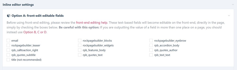 perfect, @bernhard ! thanks a lot, frontend output works fine, just tested it. but now i get while frontend editing: 6Γ PHP Warning: Undefined variable $k in ...\veraenderung\site\modules\RockFields\RockFields.module.php:342 plus two bullets @ radio fields in the block: -