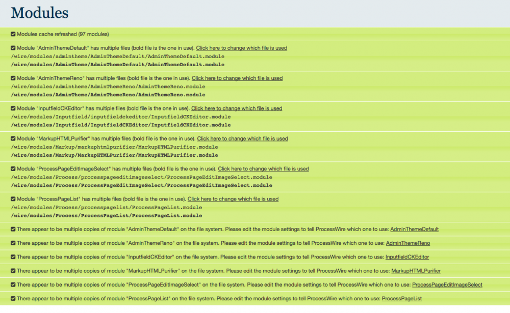 Hey all, here to report a big issue I'm facing. I've searched in the forum and found similar situations but without any solutions. When I click on "Module refresh" my admin theme (Reno) revert back to the older one pw had long time ago. Worst than this now I cannot reach the page tree because pw says "The requested process does not exist". I've attached a couple of screenshots. I'm on Pw 2.8.35, no modules installed yet. A plain and clean multi-language installation on MAMP Osx. Suggestions? Thanks!