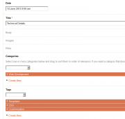 Hello, I'm trying to find a way to sort tags when editing a page. So I tried the blog profile with PW 2.3.8 on XAMPP 1.7.7/Windows 7. I found that while the tags field is defined as Select, in the editing form it is definitely a PageAutocomplete. I tried a custom selector ("parent=/tags/,sort=name") with the "Selectable Pages" dialogue and, sure enough, when I saved it, the page edit field changed to a Select. The PageAutocomplete option is not even available (I checked and it's installed). These are the first and only things I've done after install. Regarding sort, I then changed the input field type to AsmSelect keeping the custom selector, but the tags list is still not sorted (see the second image). OK, this one should be on a different topic.