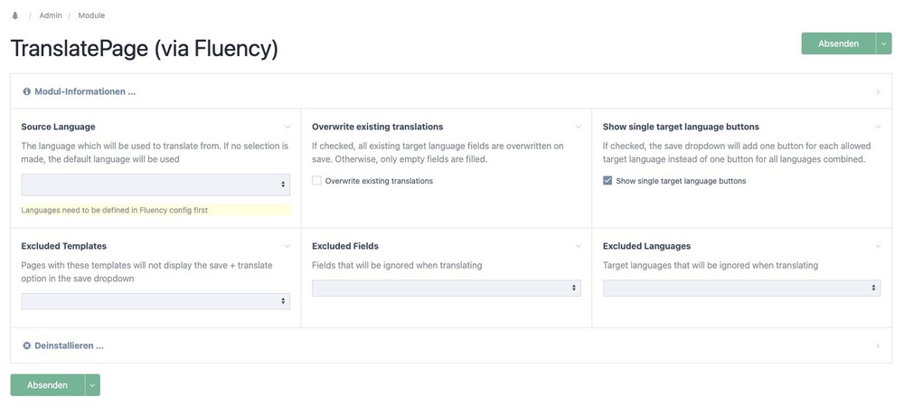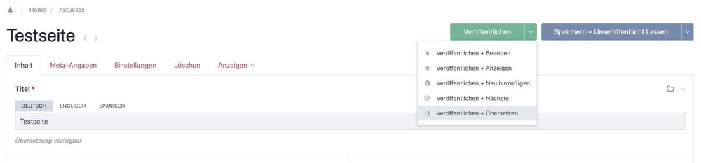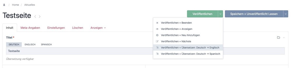 @bernhardSure ? Module Config (sorry for the mixed labeling, I have the german language pack installed ? ): Publish + Translate to all target languages at once: Publish + Translate to single languages (on the left side of the arrow: source language, right: all available (aka not excluded) target languages):