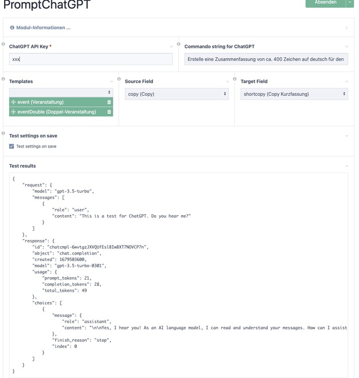 Thanks for all of your comments and suggestions. I renamed the module to PromptChatGPT (thank you @gornycreative for the input!). The renamed repo can be found here: https://github.com/robertweiss/PromptChatGPT Additionally, I have included the composer vendor folder by default, which seems to be a better and easier way to distribute modules. Thanks to @wbmnfktr for bringing this to my attention. Regarding the curl/ssl errors, as you have already deduced, these seem to be linked to the external dependency https://github.com/orhanerday/open-ai. Therefore, if the issues you mentioned persist, we should consider creating a new Github issue there. For easier debugging, I have added a ›test settings‹ option to to verify if ChatGPT responds correctly. I have also included a new option to select templates that should include the dropdown option.