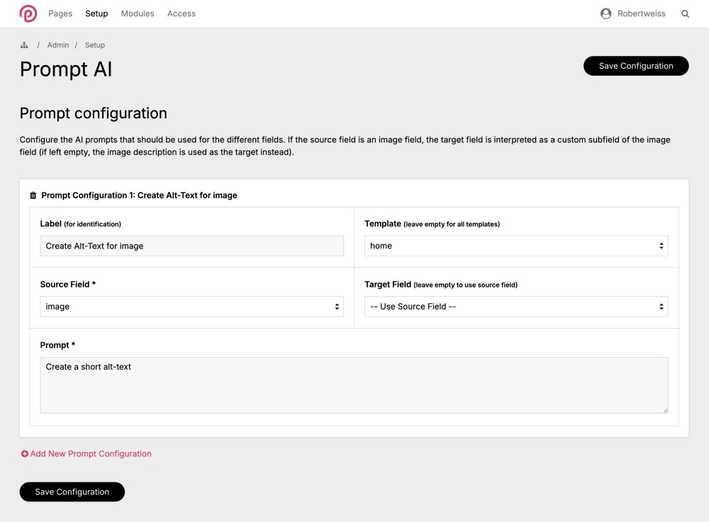 PromptAI Module Update V1.1: New Config UI & Individual Buttons! 🎉 Hey everyonre, I just pushed an update to the PromptAI module that replaces the old textarea configuration with a proper form interface at Setup > Prompt AI. No more typing template::source::target::prompt manually – now you get actual fields and buttons like a civilized person! 😄 I also added an "Individual Prompt Buttons" option that lets you create separate "Save + [Custom Label]" buttons for each prompt configuration instead of one generic button. So you can have "Save + Create Summary", "Save + Generate Alt Text", etc. and run just the specific prompt you want. Existing configs migrate automatically, so updates should run smoothly. Feedback welcome as always. The module has now been added to the ProcessWire module list: https://processwire.com/modules/prompt-ai/