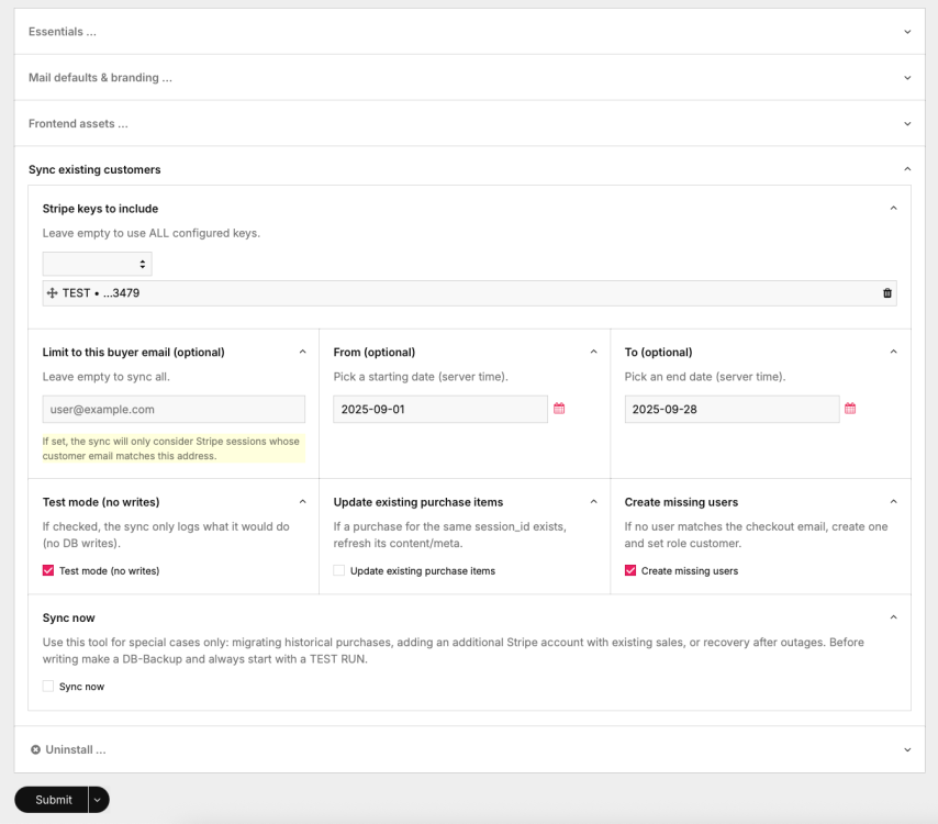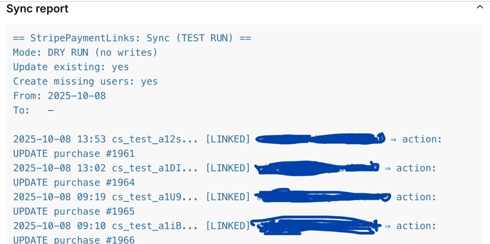 module StripePaymentLinks – Simple Checkout Integration for ProcessWireMikel replied to Mikel's topic in Modules/Plugins New feature in StripePaymentLinks (v 1.0.7) 🎉 Hi, everyone! We’ve just added a sync helper to the modules config screen that can pull past Stripe Checkout Sessions into ProcessWire. Super handy if you want to… backfill older purchases migrate existing users or just double-check what’s in Stripe vs. what’s in PW How it works: Scans Stripe sessions (with date range + email filter if you like) Matches them to PW users by email Creates missing users (optional) Creates/updates purchase repeater items exactly like live checkouts Has a test-run mode so you can preview before writing You get a nice report right on the config screen (below "Sync now") with totals and per-session actions (SKIP, LINKED, UPDATE, CREATE) plus the line items. Makes it a lot easier to keep things in sync — especially if you had sales before installing the module. Note: since each run fetches sessions and line items directly from Stripe’s API, the total duration depends on network + Stripe’s response times. In our tests with ~120 sessions the sync took about 15 seconds. Grab the latest version and give it a spin. We already tested this version on some live projects and everything works fine, but always backup before you mess with data 😉 Feedback welcome! 🙌 Cheers, Mike