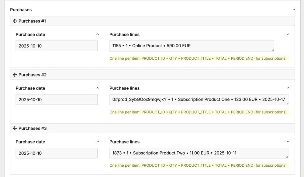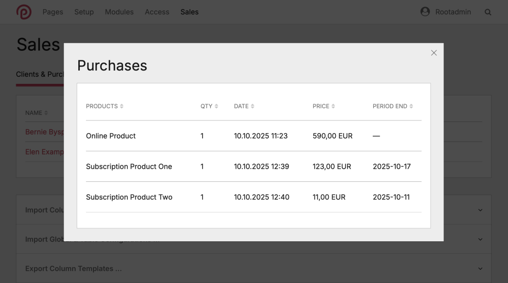 module StripePaymentLinks – Simple Checkout Integration for ProcessWireMikel replied to Mikel's topic in Modules/Plugins Hey folks! We’ve had a bunch of questions about how purchases show up in the backend, so here are the details: By default, every purchase gets its own repeater item on the user’s profile, and every product bought is pulled straight from the checkout session and listed as a line item. The PRODUCT_ID is the mapped page id, and in case the product does not have a product page it shows the Stripe product id prefixed with "0#": The full session always sits in the purchases.meta object. That means you can totally use the ProcessDataTables module to show whatever data you want in a nice table. For example, you could have an customer table with a column that totals up all purchases and pops up a full list of purchases in a table when you click on it: If you're looking to do just that, here’s the column template to make it happen: sales.column.php