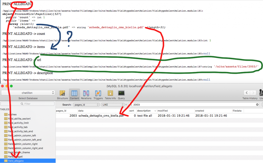 I have a field FileType named allegato into a repeater named documenti I want to retrieve the value of the field allegato for all pages for creating a custom field module; Into the module i have this code foreach($output->documenti as $item) { echo "PRINT ALLEGATO"; var_dump($item->allegato); echo "PRINT ALLEGATO -> count"; //this line echo the count as 1 var_dump($item->allegato->count); echo "PRINT ALLEGATO -> items"; /(/this line get NULL.... WHY? var_dump($item->allegato->items); echo "PRINT ALLEGATO -> url"; var_dump($item->allegato->url); // this line get me the url ... without the name of the file ???? echo "PRINT ALLEGATO -> description"; var_dump($item->allegato->description); //this line get me null though the value exist in the table (see image below) The result is where i show only one row (id 2003). Why i am not able to retrieve the value of $object->items?? And why $item->allegato->url show a partials url of the attachment and $item->allegato->description print null??? the same code into a single template work fine and output the correct values Thank you in advance