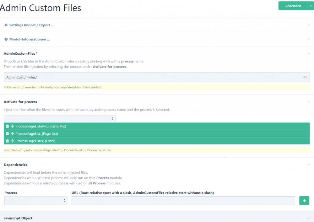24. @arjen I think I am to stupid to get it to work. Here is a screen of my settings. then I added these files to the AdminCustomFiles directory but none of them gets loaded when I am on a PageList page or a ListerPro page. Do I need to select dependencies first? However, I still think that it should be a core function that lets us choose, where our styles and scripts get inserted. AdminCustomFiles is the more advanced solution, if you want to select which files get injected for what process. But for me thats overkill, and I want one file for all pages in the admin.