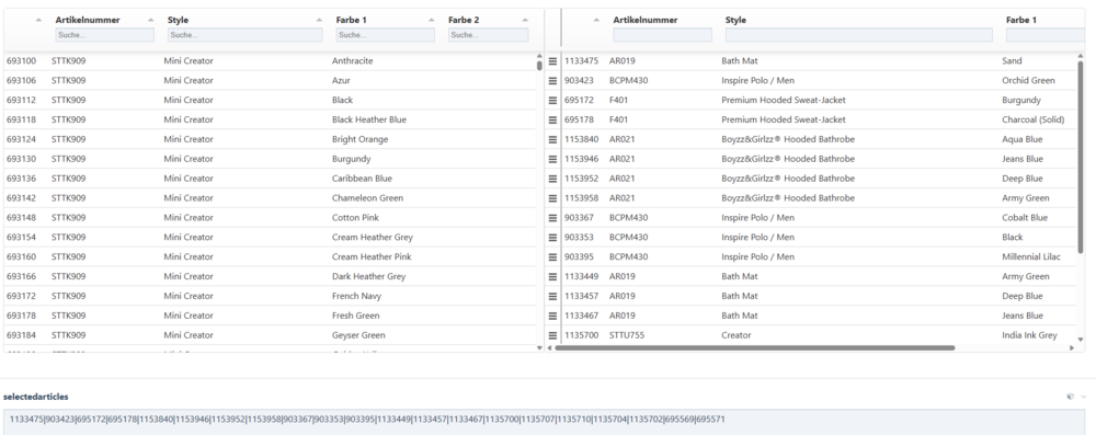 Yes, sure. I have my custom tabulator.info integrated to select which products in which order should appear in a category of a shop like "shirts for boys, single color", "shirts for girls, multicolor", "caps", "hoodies" and more. On the left you see a tabulator with all available products. When clicking a product, it is moved to the right tabulator, which displays the selected products. Then you can reorder the products in that second tabulator via drag and drop. When saving the page the id's and their order are saved to another field (selectedarticles). Later on the frontend, the products in this category should be displayed in the manually specified order. Sure, I could have created pages for this, but this would produce much overhead (as I have many categories and for each category you can choose which products and in which order) and I only need a reference to the original product page. I did something similiar like your example code, but it would be nice, if ProcessWire would provide a sort=false option or something similar to retain the order. -