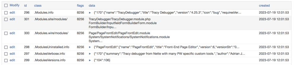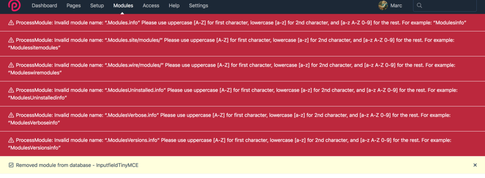 Not sure what caused this but i seem to have these entries in the modules table with a period, and seem to be causing some error notices in the modules screen. Deleting those rows does solve the issue; Posting here in case someone else runs into this. Seems to have been caused by some upgrade/downgrade process of the core.