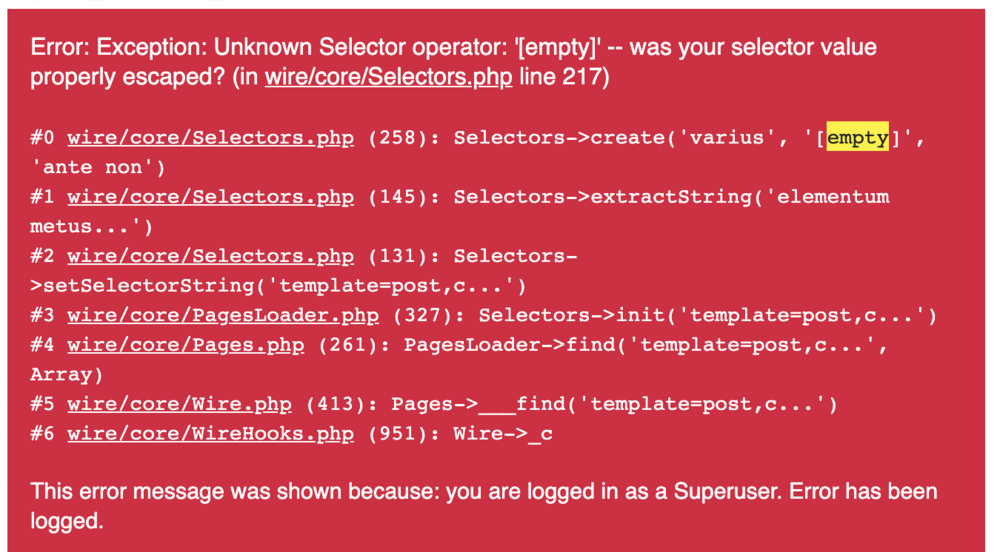 What I am trying to do: On a blog post page, I am adding a small snippet at the bottom that has the 2 most recent blog posts by the current page author, excluding the blog post title that we are actively reading. That part works... // if this page has an author listed, s/he becomes the active $author and this page is the $activepost if ($page->cbpage2->id) { $author = $page->cbpage2; $activepost = $page->title; // Get the posts... $articles = $pages->find("template=post, cbpage2=$author, limit=2, title!=$activepost, sort=-cbdate" ); // and then format the results for each found... foreach ($articles as $article) { echo "..."; } One author post had a comma in the blog post title which broke this, and I assume this needs to be santized because I reference title!=$activepost this didn't work... $articles = $pages->find("template=post, cbpage2=$author, limit=4, title!=$activepost, sort=-cbdate" . $sanitizer->selectorValue($title)); I assume I have to sanitize BEFORE: $pages->find since it's dragging in the comma, but since I have the $activepost = $page->title; No method I've tried seems to be working. Rather than tell everyone "don't use commas!" I'd love to figure this out, but coming up with tragic results like: $dirtyarticles = $pages->find("template=post, cbpage2=$author, limit=4, title!=$activepost, sort=-cbdate") $cleanarticles = $sanitizer->selectorValue($dirtyarticles)); and that sure isn't right... ?