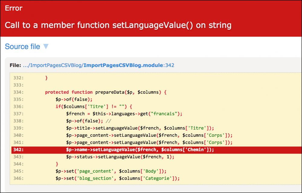 Ok, got it. $french = $this->languages->get("francais"); $page->of(false); // page->setLanguageValue($french, 'title', $columns['Titre']); $page->setName($columns['Chemin'], $french); $page->set("status$french", 1); -