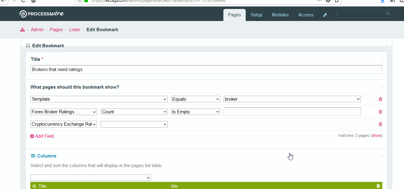 My bookmark isn't being saved properly, as it saves a different selector than what I chose A gif video showing this bug is below. I am using Processwire 3.0.62 I believe that there is a bug with saving bookmarks where the selector being saved is 2 "is empty" for a 2 repeater fields which have OR on them. Update This has been fixed in the latest version of Processwire, specifically the 3.0.94 version