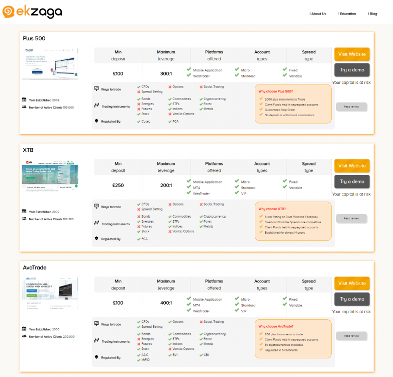 I've made a website for a client, called Ekzaga which serves multiple purposes. It is a forex broker and cryptocurrency exchange directory, as well as a trading tutor marketplace. The trading tutor marketplace section is hidden as my client is trying to get various tutors to join the website willing to teach students, but it does exist in the code, you just can't access it online. Launch Ekzaga