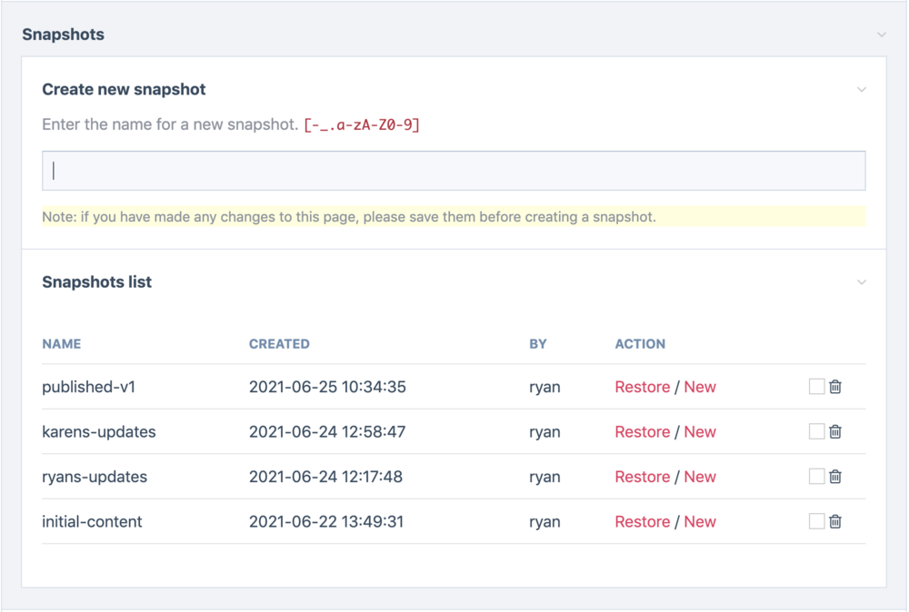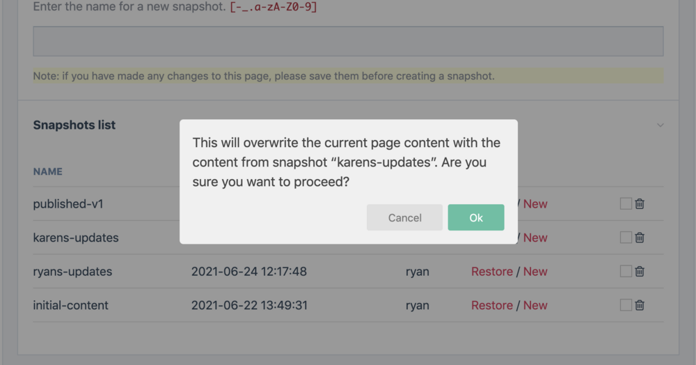 I've got some core updates in progress but nothing major committed yet, so we'll save that for next week. But I wanted to briefly tell you about a module I'm working on here, which I plan to eventually put in core. I built it for some needs I've had here, but it will first be released in ProDrafts (so ProDrafts may start using its API), and in ProDevTools too, since it is also a developer tool. It's a snapshot versioning system for pages, but more of an API tool at this stage, kind of like the $pages API var, but for snapshots/versions of pages. It lets you create a snapshot of any page, including its fields and files (including core fields, ProFields, 3rd party fields, repeaters, nested repeaters, table fields with a million rows, etc.). The snapshots can be restored at any later time. Snapshots may also be restored to a different page, such as a new or existing page. In this manner, a module like ProDrafts may be able to use it to manage draft versions even better than it currently can, or at least that's the plan. Though since it's an API tool, my hope is that when/if it winds up in the core, others may be able to use it for stuff we've not thought of yet too. The module is a little different than my previous attempts (like what's in ProDrafts now) in that it does most of its work directly at the database level (and file system level, where applicable), which enables it work without needing to know much about the Fieldtype. Currently it is fully functional, but I have a few less common cases to work out before it's ready for release. Once installed, every page includes a Snapshots fieldset, which can be located in the settings tab of the page editor, or a separate tab in the page editor (configurable). When installed, every page has one, so long as the user has the appropriate permissions. There's a screenshot of what it looks like in the page editor below, but it is very simple at this stage, basically just enough for testing purposes. Every snapshot has a name that is unique on the page. You can overwrite a snapshot just by saving a snapshot with the same name on the same page. So you could for instance have a hook that creates a snapshot named "undo" right before a page is saved (in a Pages::saveReady hook), and in that way a module could add a basic undo capability to the page editor. This is just a simple example though. Thanks for reading, have a great weekend!