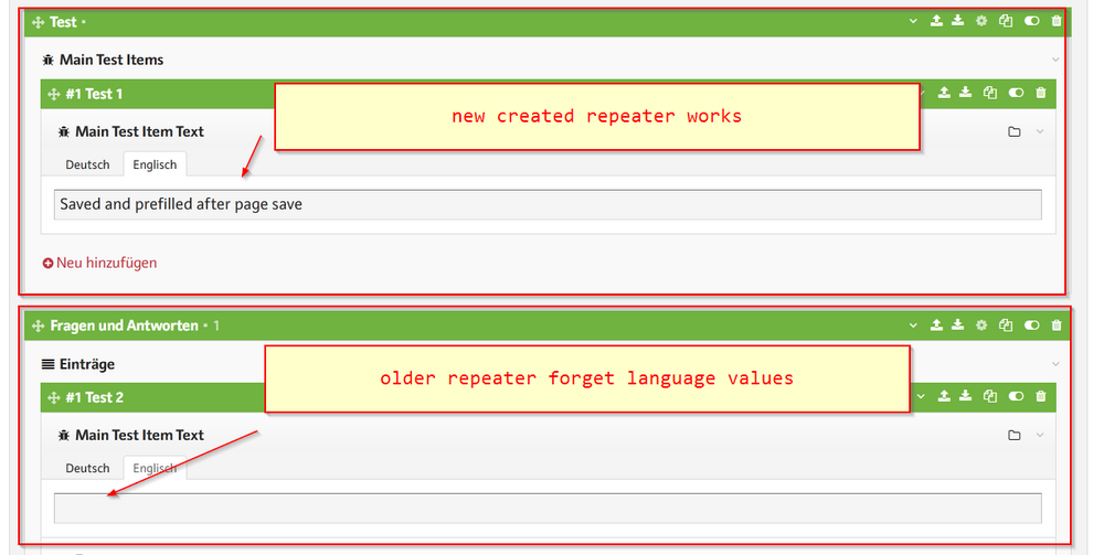 A client discovered a strange issue in 3.0.246. Setup: Multilang is active and 2 or more languages are active A Repeater Matrix item contains anyone default repeater Multilang text fields (input, RTE) in default repeater After fresh CMS login it seems to be fine. All multilang fields are prefilled with stored inputs to edit (default behaviour). But after a page save, multilang values got saved but only the default language is still prefilled. Each other multilang inputs are no longer prefilled and just empty. That means data lost is very easy possible just by saving anyone page. I can't reproduce the issue in 3.0.229, but always in 3.0.246. On 5+ websites including my own. It seems to be a bug with prefilling some multilang fields by cvontext (missed value="saved input"). The chance to lost data is high. Does anyone know a quick workaround?