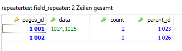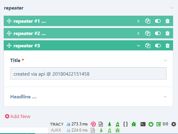 1. OK finally I came back to this one and I found the problem. See these Tracy Console codes: Works: $p = $pages->get(1002); $p->of(false); $r = $p->repeater; $item = $r->getNew(); $item->title = 'created via api @ ' . date('YmdHis'); $item->save(); $p->repeater->add($item); $p->save(); d($p->repeater->count); Does NOT work: $p = $pages->get(1002); $p->of(false); $r = $p->repeater; $item = $r->getNew(); $item->title = 'created via api @ ' . date('YmdHis'); $item->save(); $r->add($item); // <<------------ here is the change $p->save(); d($p->repeater->count); Saying "does not work" I mean, that a d($pages->find('repeater.count>0')->each('path')); does NOT list a page with a repeater item added via the second code example, whereas it shows pages where I used the first (upper) example. Looking at the database it becomes obvious why: For the page with id 1002 there is no data and no count value present. @Robin S you should be able to reproduce it now. I've tested it on a fresh 3.0.99 dev version with the default profile and just added a repeater to the basic-page template. I'm not sure if this is a bug or I just have to use the api correctly... But at least I think it is an odd behaviour since it looks like everything is working correctly also with the bad code and you might not notice that you are in trouble... Items are available and even published: Here is the github issue: https://github.com/processwire/processwire-issues/issues/413