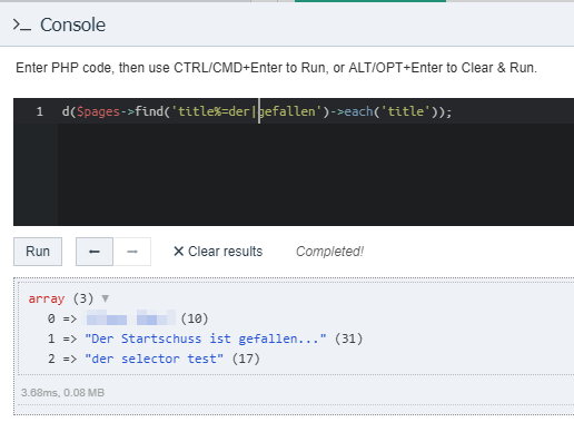 if i understand him correctly this would still not be what he wants, because it would also find this page: title = the red island body = three dogs lived happily... i guess it should NOT find this page? i think proper searching is beyond what can accurately and easily be done with selectors. one forum member recently linked to this search service: https://www.algolia.com/product that is free until 10k records and 100k operations. google custom search could also be an option: https://developers.google.com/custom-search/ and last but not least we have the elastic search module that looks like it could match perfectly for you. i've never used it though, so it would be nice to hear some experiences from others: https://modules.processwire.com/modules/elastic-search/