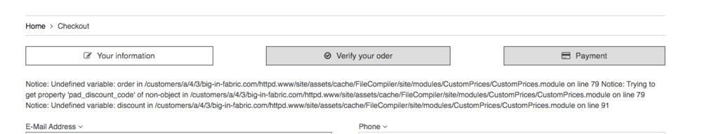 Hi Guys, I found that my site is producing this notice on the front end, even when $config->debug = false and also when admin is not even logged in. How do I keep the site from displaying this message to front end users? The notice is about a few vars being tested, which in this case aren't defined, how would I stop that from happing all together when testing vars? if I for instance wrap the $discountCode = blabla in a if($order) { ... } statement than I'm again testing for $order which isn't a object in this case which throws another notice.. This is the notice: Here is my current code: // PAD DISCOUNT CODE HOOK // First we see if we have active discount code if ($this->session->orderId) { $order = $this->pages->get($this->session->orderId); } if($product->geen_korting == 1) { $nodisc = $product->geen_korting; } else { $nodisc = $product->parent->geen_korting; } $discountCode = $this->sanitizer->selectorValue($order->pad_discount_code); $dc = $this->pages->get("template=paddiscount, title=$discountCode"); if ($dc->id) { if ($nodisc) { $discount = 0; } elseif ($dc->pad_percentage) { $discount = $newprice * ($dc->pad_percentage / 100); } } $event->return = $newprice - $discount; Thanks in advance ?