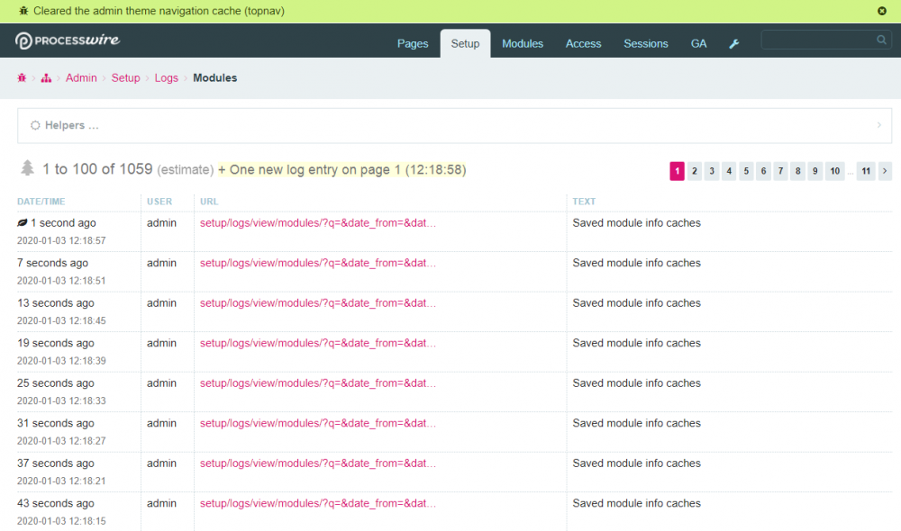 I have a site, recently upgraded to latest master and latest PHP. Almost every time I go to Pages or Setup or Modules in the admin navigation (I'm using AdminThemeDefault), I get a notice: "Cleared the admin theme navigation cache (topnav)." When I view modules.txt in the admin, after every XHR refresh, there is a new log entry, as seen on the screenshot: "Saved modules info caches". I cleared the cache folder and caches table in DB to no help. Any ideas? I don't think it has anything to do with the upgrade, as I reverted back to previous version of PW. Something with DB? EDIT: stupid me. I had $modules->refresh() in my admin.php Mods: you may delete this post.