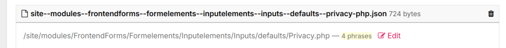 Good morning Jan! I guess you have installed the language support module first?? If not, here is a little screen cast how to do it. You will need it to translate strings. Languaga install.MP4 You are German speaking too , so you could install the language files for German translations from the module itself as shown in the clip. Now every English phrase should be translated into German, but if you are not satisfied with the translation text, you can overwrite it with your own text (but be aware that every time you install the translation files again, every changes will be overwritten). You will find the file containing the text for the privacy checkbox here: By clicking the "Edit" link you will be redirected to the editable page: There you can make your changes if you want. Not out of the box. Maybe you can use URL segments and put each form on a segment page. Example if form 1 is valid, then you will be redirected to the URL segment 2 which contains form 2 and so on. You will need to store the form values inside a session variable. At the end (last URL segment) you can take all the values stored in the session variable and output it to the user (as a kind of list of entered values) Every value output to the user should have an edit link next to it and if the user clicks on the link, he will be redirected to the appropriate form, where he can change the value. I would add a query string at the end of the link to determine that the user wants to change something. If the user have changed the value, everything is valid and the query string is present in the URL then the user will be redirected directly to the last page again, where he can check his entered data once more. If there is a need for changing another value, then he clicks on the next edit link and so on. That was my idea, but you could also write a question in the general forum about this issue. I guess there are some people who have written a multi-page form and can give you a hint how to solve it. FrontendForms only creates single forms, but it is not impossible to combine the values of multiple single forms by using sessions. Good luck!