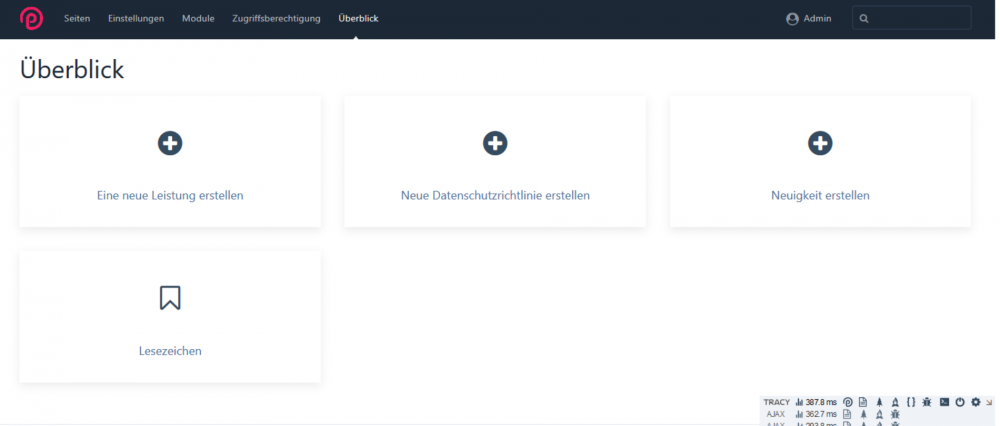 Now this works: $module = wire('modules')->getModule('ProcessPageAdd'); $test = ($module->executeNavJSON()); return $test; This gives me the following json-output: {"url":"\/processwire\/processwire\/page\/add\/","label":"Modules","icon":"plus-circle","add":null,"list":[{"url":"?parent_id=1016&template_id=57","label":"Eine neue Leistung erstellen","icon":"plus-circle","parent_id":1016,"template_id":57},{"url":"?parent_id=1048&template_id=51","label":"Neuigkeit erstellen","icon":"plus-circle","parent_id":1048,"template_id":51},{"url":"bookmarks\/?role=0","label":"Lesezeichen","icon":"bookmark-o","className":"separator separator"}]} And these are the pages I was looking for: list":[ {"url":"?parent_id=1016&template_id=57","label":"Eine neue Leistung erstellen","icon":"plus-circle","parent_id":1016,"template_id":57},/n{"url":"?parent_id=1048&template_id=51","label":"Neuigkeit erstellen","icon":"plus-circle","parent_id":1048,"template_id":51}........ So I get: parent_id: 1016, template_id:57 and parent_id:1048, template_id:51 These are the 2 pages that I have in the shortcut menu and the IDs that I need? So for the moment my new dashboard has the same functionality as the add-new navigation of PW, but a little more userfriendly than the small navigation in the left corner. New shortcut items can be added via the bookmark button, so every user can add his own favorites shortcuts to make his dashboard individually (if he has the rights of course ;-).