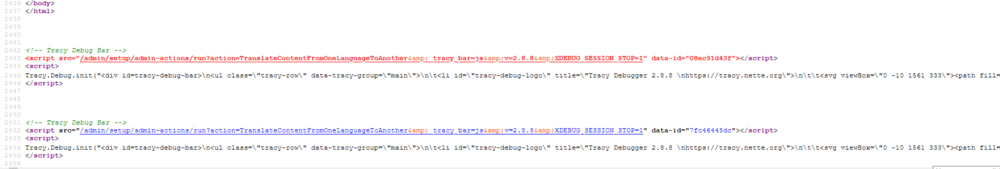 Good day, @adrian! I am debugging an Admin Action (yes, another module of your's)). I get an error and try to debug with bd(). I can see the Tracy bar and the dumps count appear. But then I hover the cart with dumps popup doesn't show. Actually no popups in the bar work. I get this message in the browser dev tools console: I also notice, that the Tracy code is added to the document twice: Why can that happen? Tracy seem to work as it should on other pages.